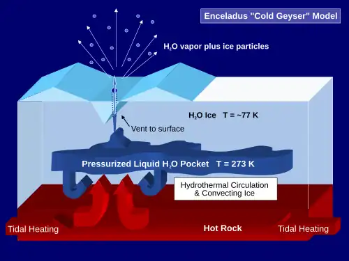 In addition to water, these geysers from vents near the south pole contained small amounts of salt, nitrogen, carbon dioxide, and volatile hydrocarbons. The melting of the ocean water and the geysers appear to be driven by tidal flux from Saturn.