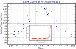 ![]() Two light curves for FF Andromedae are shown. The main plot shows the variation in brightness as the star rotates, and the inset plot shows a flare that occurred on 18 October 1991. Adapted from plots in Bopp et al. 1977[1] and Peres et al. 1993.[2] | |