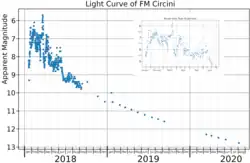 FM Circini's outburst and decline from peak brightness was observed by the Gaia spacecraft, the All Sky Automated Survey for SuperNovae and AAVSO observers.[5][6] The nova rose slowly to peak brightness, and then fluctuated between magnitude ~6.5 and ~8.5 for about three months, before beginning a nearly monotonic decline.[6] It took 150 days for FM Circini to fade from peak brightness by 2 magnitudes, which makes it a "slow" nova in the classification scheme of Cecilia Payne-Gaposchkin.[7]