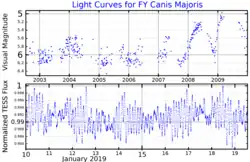 In 1967, Alejandro Feinstein detected low amplitude (0.14 magnitude) variability in HD 58978's brightness, from photoelectric observations at La Plata Observatory.[10] The star was given the variable star designation FY Canis Majoris in 1973.[11] During an outburst in 2009, the star brightened to magnitude 4.8, its historical peak brightness.[2] TESS data show that FY CMa pulsates at many different frequencies, with periods ranging from 1.07 hours to 5.8 days.[12]