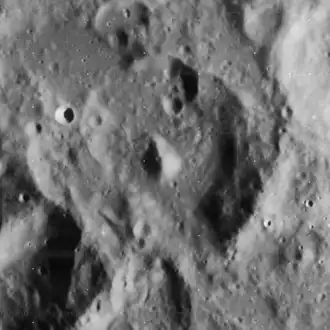 Faye is a heavily eroded lunar impact crater in the rugged southern highlands of the Moon. It is named after French astronomer Hervé Faye.[1] It is attached to the northeastern rim of the crater Delaunay, with Donati located just a few kilometers to the northeast. It forms part of a chain of craters of increasing size to the southwest that continues with La Caille and ends with the walled plain Purbach.