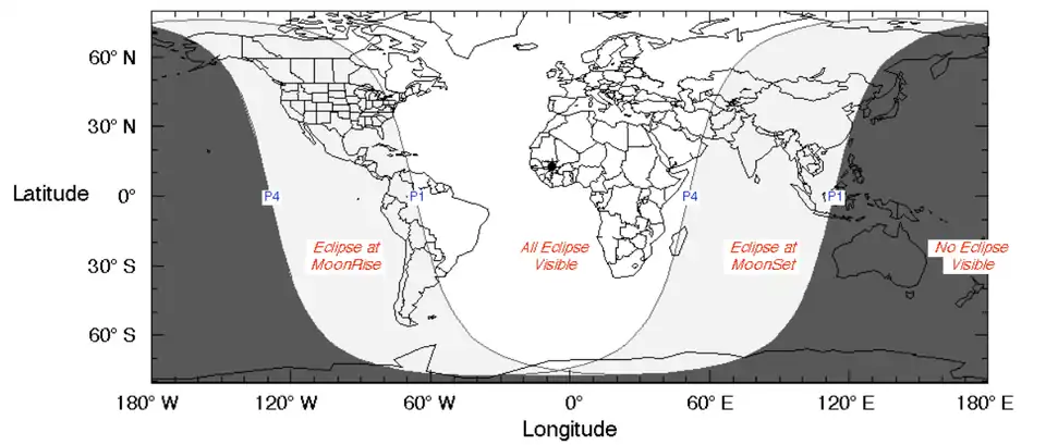 The eclipse was completely visible over northeastern North America, eastern South America, Europe, Africa, and west Asia, seen rising over much of North America and western South America and setting over south and east Asia.[3]