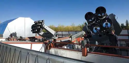 The RAPTOR system (Rapid Telescopes for Optical Response) is a specialized suite of robotic telescopes designed to detect and track transient objects, including gamma-ray bursts and near-earth objects. RAPTOR was built by a Los Alamos team headed by astrophysicist Tom Vestrand. The system consists of six robotic observatories—RAPTOR-A, -S, -P, -K, and -T are located at Fenton Hill and RAPTOR-B is located at the Los Alamos Neutron Science Center, 38 miles (61 km) away.[5] The telescopes are all networked and controlled by a centralized computer system. The older RAPTOR telescopes, RAPTORs A, B, S and P each consist of a wide-field telescope and a narrow-field telescope. They are mounted on platforms that can swivel to any point in the sky in less than 3 seconds, making them the fastest moving telescopes ever built.[5] Each wide-field telescope has a nominal field of view of 38 by 38 degrees, which equates to being able to cover the sky in eleven patches. Each telescope is actually two telescopes giving stereoscopic vision. There is a zoom mechanism built into each telescope as well. While in monitoring mode, RAPTOR takes two consecutive 30-second exposures through its two wide-field telescopes and analyzes the resulting digital images. If it sees an interesting event, RAPTOR zooms in for a closer look with the two narrow-field telescopes.