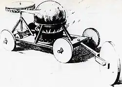 However, comparison with drawings in Hardenberg's study shows that this model is not the same as Verbiest's. It is actually modelled on a small steam turbine car built in the late 18th century (presumably 1775) by a German mechanic that was inspired by Verbiest's vehicle but different, for example, only with three wheels.[21] Unfortunately, the original was probably destroyed during a bombing raid on the Technische Hochschule Karlsruhe during World War II. However, a photo of the original car can be seen at the Deutsches Museum. Hardenberg notes that this steam turbine car operated on the same principle as Verbiest's carriage (the impulse turbine), but employed a more modern arrangement of the drive train.[24]