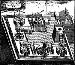In 1664, the Chinese astronomer Yang Guangxian (1597–1669), who had published a pamphlet against the Jesuits, challenged Schall von Bell to a public astronomy competition. Yang won and took Schall von Bell's place as Head of Mathematics. Having lost the competition, Schall von Bell and the other Jesuits were chained and thrown into a filthy prison, accused of teaching a false religion. They were bound to wooden pegs in such a way that they could neither stand nor sit and remained there for almost two months until a sentence of strangulation was imposed. A high court found the sentence too light and ordered them to be cut up into bits while still alive.[6] Fortunately for them, on 16 April 1665,[7] a violent earthquake destroyed the part of the prison chosen for the execution. An extraordinary meteor was seen in the sky, and a fire destroyed the part of the imperial palace where the condemnation was pronounced.[8] This was seen as an omen and all the prisoners were released. However, they still had to stand trial, and all the Jesuits but Verbiest, Schall von Bell and two others were exiled to Canton. Schall von Bell died within a year, due to the conditions of his confinement.[4]