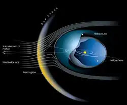 The Fermi glow consists of ultraviolet-glowing[2] particles, mostly hydrogen,[3] originating from the Solar System's bow shock, created when light from stars and the Sun enter the region between the heliopause and the interstellar medium[4] and undergo Fermi acceleration,[3] bouncing around the transition area several times, gaining energy via collisions with atoms of the interstellar medium. The first evidence of the Fermi glow, and hence the bow shock, was obtained with the help from Voyager 1[2][4] and the Hubble Space Telescope.[2][4]
