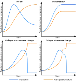 • Collapse With Resource Change: Similar to the previous scenario, but in this case, the civilization attempts to transition to sustainable resources. However, the change comes too late, and the environmental damage is irreversible, still leading to the civilization's collapse.[99][100]