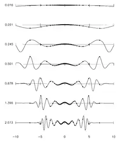 A similar analysis can be carried out for a galaxy that is idealized as a one-dimensional wire, with density that varies along the axis.[7] This is a simple model of a (prolate) elliptical galaxy. Some unstable eigenmodes are shown in Figure 2 at the left.