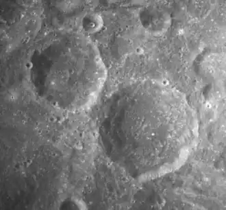 ![]() Apollo 16 Mapping Camera image. Firsov below right of center, Firsov V above left of center | |