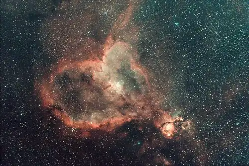 The Fish Head Nebula, or the Northern Bear Nebula, is part of a large star forming system of gas and dust located along the Perseus spiral arm of the Milky Way.[1] The nebula is located in the Constellation Cassiopeia, approximately 6,000 light-years from Earth and is adjacent to the much larger Heart Nebula.[2] The brighter region of the nebula is designated NGC 896 and is the home to many young and large stars. These stars radiate high amounts of ultraviolet light. This UV radiation excites the surrounding gas and causes it to shine at a high brightness. This mapping is known as false color and is common with many of the Hubble Space Images.[3]