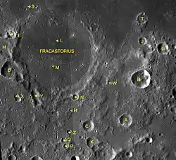 By convention these features are identified on lunar maps by placing the letter on the side of the crater midpoint that is closest to Fracastorius.