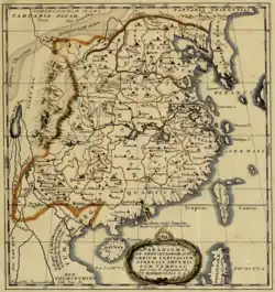 He debarked at Macao on 9 August 1685, where the return of some shipwrecked Japanese sailors caused him to hope that trade would be resumed; this was fruitless.[4] He made his vows of poverty, chastity, obedience, and the fourth vow of "special obedience" to the pope on 2 February the next year[1] and, after a final failed attempt to reach Japan,[5] finally formally joined the China mission[1] by September 1687.[5] He is sometimes numbered among the Figurists,[6] the Jesuit missionaries who came to think that Christianity had been the ancient religion of China, brought there by Noah's son Shem.