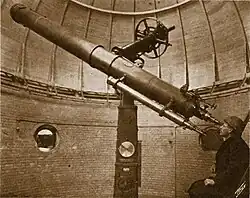 The observatory contains a 12-inch refracting telescope with a weight-driven mechanical clock drive. The original glass blanks that were to become the optics were procured in 1919 by Prof. Irving P. Church, head of the Cornell Department of Civil Engineering; the two-element lens was ground and polished by the well-known firm of Brashear & Co. and delivered to Cornell in 1920. In January 1922, a contract was given to the Warner and Swasey Co. of Cleveland, Ohio to build the mount. On October 16, 1922, the telescope was erected upon its German equatorial mount in the central dome of the Fuertes Observatory. The observatory's original 4.5-inch telescope was mounted onto the 12-inch refractor, and currently serves as the finder scope.[3]