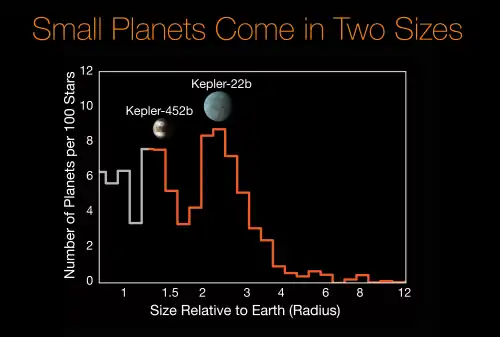 The small planet radius gap (also called the Fulton gap,[1] photoevaporation valley,[2][3] or Sub-Neptune Desert[4]) is an observed scarcity of planets with radii between 1.5 and 2 times Earth's radius, likely due to photoevaporation-driven mass loss.[5][6][7] A bimodality in the Kepler exoplanet population was first observed in 2011[8] and attributed to the absence of significant gas atmospheres on close-in, low-mass planets. This feature was noted as possibly confirming an emerging hypothesis that photoevaporation could drive atmospheric mass loss[5][9] This would lead to a population of bare, rocky cores with smaller radii at small separations from their parent stars, and planets with thick hydrogen- and helium-dominated envelopes with larger radii at larger separations.[5][9] The bimodality in the distribution was confirmed with higher-precision data in the California-Kepler Survey in 2017,[6][1] which was shown to match the predictions of the photoevaporative mass-loss hypothesis later that year.[7]