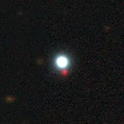 ![]() The white dwarf GD 165 A is seen in the center of the image as a bright star. The brown dwarf GD 165 B is below the white dwarf, seen as a red spot. | |