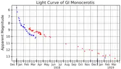 GI Monocerotis, also known as Nova Monocerotis 1918, was a nova that erupted in the constellation Monoceros during 1918. It was discovered by Max Wolf on a photographic plate taken at the Heidelberg Observatory on 4 February 1918. At the time of its discovery, it had a photographic magnitude of 8.5, and had already passed its peak brightness. A search of plates taken at the Harvard College Observatory showed that it had a photographic magnitude of 5.4 on 1 January 1918, so it would have been visible to the naked eye around that time. By March 1918 it had dropped to ninth or tenth magnitude.[5][6] By November 1920 it was a little fainter than 15th magnitude.[7]