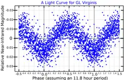 Located 21.1 light years away, GL Virginis has a spectral type of M4.5V and an effective temperature of approximately 3110 K.[9] Its luminosity (emitted in the visible section of the electromagnetic spectrum) is only one ten-thousandth compared to the Sun; however, since a significant fraction of its radiation is emitted as invisible infrared light, its bolometric luminosity increases to 0.5% of that of the Sun. Its mass is 12% that of the Sun[7] and its radius is 16% of the Sun.[8] It is a fairly rapid rotator: its rotational velocity is least 17 km/s,[8] which implies that it takes less than half a day to complete a rotation on its axis. The star is emitting a frequent flares, with at least five detected by 2019.[4]