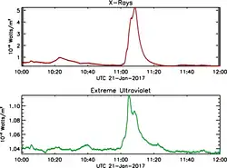 The Extreme Ultraviolet and X-ray Irradiance Sensors (EXIS) are a pair of sensors that monitor solar irradiance in the Earth's upper atmosphere. In monitoring irradiance, EXIS can detect solar flares which can disrupt power grids, communications, and navigational systems on Earth and satellites. Variability in irradiance influences conditions in the ionosphere and thermosphere. The Extreme Ultraviolet Sensor (EUVS) monitors changes in solar extreme ultraviolet irradiance which shape upper atmospheric variability,[64] with an ultraviolet wavelength range of 5–127 nm.[65] Data from EUVS can anticipate radio blackouts for high frequency (HF) communications in low latitudes and the expansion of the thermosphere, which can induce increased drag and degrade instruments on satellites in low Earth orbit. The X-Ray Sensor (XRS) component of EXIS monitors solar flares through X-ray irradiance, allowing for the prediction of a solar particle event.[64] The XRS detects X-rays with wavelengths between 0.05–0.8 nm.[65] Together, the EXIS instrument weighs 30 kg (66 lb) and consumes 40 W of power.[64]