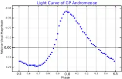 ![]() The visual band light curve of GP Andromedae, shown over one pulsation cycle, adapted from Szeidl et al.[1] | |