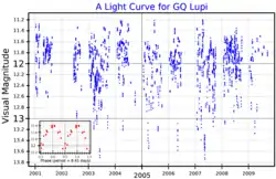 ![]() A visual band light curve for GQ Lupi. The main plot (from ASAS data[1]), shows the long-term variability, and the inset plot (adapted from Broeg et al.[2]) shows the short-term periodic brightness variation. | |