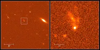 ![]() Optical afterglow of gamma-ray burst GRB 990123 (the bright dot within the white square and in the enlarged cutout) on January 23, 1999. The object above it with the finger-like filaments is its originating galaxy. This galaxy seems to be distorted by a collision with another galaxy. | |