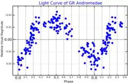 ![]() The visual band light curve of GR Andromedae, showing variation about the mean brightness. Adapted from Pyper et al. (2017)[1] | |