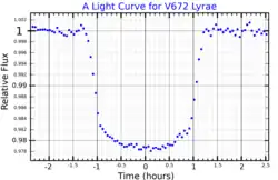 Since the planet transits the star, the star is classified as a planetary transit variable and has received the variable star designation V672 Lyrae. The transits last a little over an hour, about 4% of the orbital period, and the brightness diminishes by a few hundredths of a magnitude.[7]