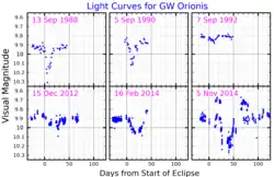 The lightcurve of GW Orionis varies with periods of 3.02 and 1.92 days, which likely correspond to the rotation periods of GW Orionis A and B, respectively.[11]