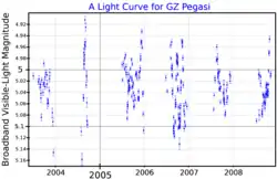 57 Pegasi is a variable binary star system in the northern constellation of Pegasus (constellation). It has the variable star designation GZ Pegasi, while 57 Pegasi is the Flamsteed designation. The system is faintly visible to the naked eye as a point of light with an apparent visual magnitude that fluctuates around 5.105.[3] It is located at a distance of approximately 780 light years from the Sun based on parallax,[2] and is drifting further away with a radial velocity of +14 km/s.[6]