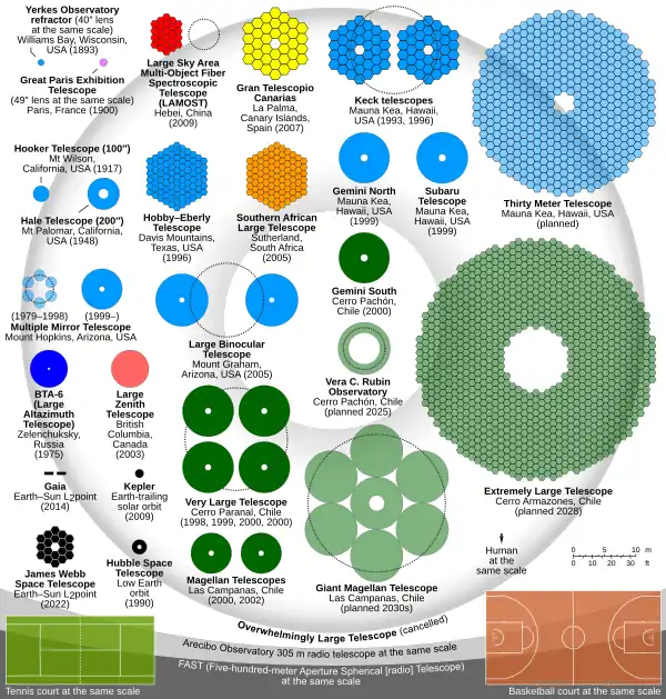 - 1.0 × 0.5 m focal plane array on which light from both telescopes is projected. This in turn consists of 106 CCDs of 4500 × 1966 pixels each, for a total of 937.8 megapixels (commonly depicted as a gigapixel-class imaging device).[38][39][40][32]