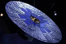 The craft headed towards the Sun–Earth Lagrange point L2 located approximately 1.5 million kilometres from Earth, arriving there 8 January 2014.[31] The L2 point provides the spacecraft with a very stable gravitational and thermal environment. There, it uses a Lissajous orbit that avoids blockage of the Sun by the Earth, which would limit the amount of solar energy the satellite could produce through its solar panels, as well as disturb the spacecraft's thermal equilibrium. After launch, a 10-metre-diameter sunshade was deployed. The sunshade always maintains a fixed 45 degree angle to the Sun, while precessing to scan the sky, thus keeping all telescope components cool and powering Gaia using solar panels on its surface. These factors and the materials used in its creation allow Gaia to function in conditions between -170°C and 70°C.[32]