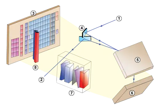 - The photometric instrument (BP/RP) allows the acquisition of luminosity measurements of stars over the 320–1000 nm spectral band, of all stars brighter than magnitude 20.[14] The blue and red photometers (BP/RP) are used to determine stellar properties such as temperature, mass, age and elemental composition.[24][33] Multi-colour photometry is provided by two low-resolution fused-silica prisms dispersing all the light entering the field of view in the along-scan direction prior to detection. The Blue Photometer (BP) operates in the wavelength range 330–680 nm; the Red Photometer (RP) covers the wavelength range 640–1050 nm.[34]