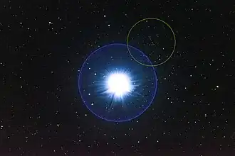 Gaia 1 is an open cluster of stars discovered in 2017 by astronomers using data from the Gaia Space Observatory. It is a high-mass and bright cluster, but it remained unseen in prior astronomy due to veiling glare in ordinary telescopes overwhelmed by the star Sirius, which lies 10 arcmins west.[2] Its half-light radius is about 29 light-years (9 pc), assuming a distance of 15,000 light-years (4,600 pc), and it has an estimated mass of about 22,000 M☉.[1]