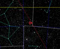 In 1958, the International Astronomical Union (IAU) defined the galactic coordinate system in reference to radio observations of galactic neutral hydrogen through the hydrogen line, changing the definition of the Galactic longitude by 32° and the latitude by 1.5°.[1] In the equatorial coordinate system, for equinox and equator of 1950.0, the north galactic pole is defined at right ascension 12h 49m, declination +27.4°, in the constellation Coma Berenices, with a probable error of ±0.1°.[2] Longitude 0° is the great semicircle that originates from this point along the line in position angle 123° with respect to the equatorial pole. The galactic longitude increases in the same direction as right ascension. Galactic latitude is positive towards the north galactic pole, with a plane passing through the Sun and parallel to the galactic equator being 0°, whilst the poles are ±90°.[3] Based on this definition, the galactic poles and equator can be found from spherical trigonometry and can be precessed to other epochs; see the table.