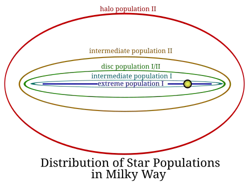 The most common benchmark elemental ratio is that of Fe/H, one of the factors determining the propensity of a region of the galaxy to produce terrestrial planets. The galactic bulge, the region of the galaxy closest to the Galactic Center, has an [Fe/H] distribution peaking at −0.2 decimal exponent units (dex) relative to the Sun's ratio (where −1 would be 1⁄10 such metallicity); the thin disk, in which local sectors of the local Arm are, has an average metallicity of −0.02 dex at the orbital distance of the Sun around the galactic center, reducing by 0.07 dex for every additional kiloparsec of orbital distance. The extended thick disk has an average [Fe/H] of −0.6 dex, while the halo, the region farthest from the galactic center, has the lowest [Fe/H] distribution peak, at around −1.5 dex.[10] In addition, ratios such as [C/O], [Mg/Fe], [Si/Fe], and [S/Fe] may be relevant to the ability of a region of a galaxy to form habitable terrestrial planets, and of these [Mg/Fe] and [Si/Fe] are slowly reducing over time, meaning that future terrestrial planets are more likely to possess larger iron cores.[10]