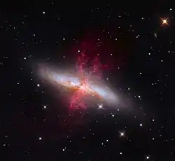 A galactic superwind, or just galactic wind, is a high velocity stellar wind emanating from either newly formed massive stars, spiral density waves, or as the result of the effects of supermassive black holes.[2] They are normally observed in starburst galaxies.[3][4]