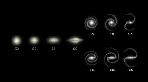 Galaxies come in three main types: ellipticals, spirals, and irregulars. A slightly more extensive description of galaxy types based on their appearance is given by the Hubble sequence. Since the Hubble sequence is entirely based upon visual morphological type (shape), it may miss certain important characteristics of galaxies such as star formation rate in starburst galaxies and activity in the cores of active galaxies.[6]