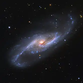 Some spiral galaxies have central bar-shaped structures composed of stars. These galaxies are called 'barred spirals' and have been investigated by Galaxy Zoo in several studies.[57][58][59][60] It is unclear why some spiral galaxies have bars and some do not.[61] Galaxy Zoo research has shown that red spirals are about twice as likely to host bars as blue spirals. These colours are significant. Blue galaxies get their hue from the hot young stars they contain, implying that they are forming stars in large numbers. In red galaxies, this star formation has stopped, leaving behind the cooler, long-lived stars that give them their red colour.[61]