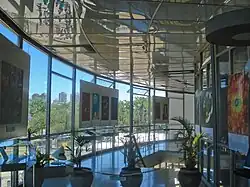 The building has five floors, six staircases and a 20 metres (66 ft) diameter room with 360 seats. The inside of the 20 m semispherical dome is covered with reflective aluminium.