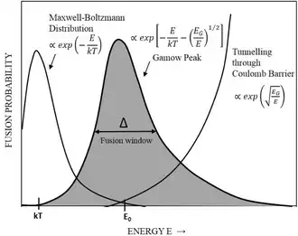 While the probability of overcoming the Coulomb barrier increases rapidly with increasing particle energy, for a given temperature, the probability of a particle having such an energy falls off very fast, as described by the Maxwell–Boltzmann distribution. Gamow found that, taken together, these effects mean that for any given temperature, the particles that fuse are mostly in a temperature-dependent narrow range of energies known as the Gamow window. The maximum of the distribution is called the Gamow peak.