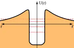 Next, the alpha decay can be modelled as a symmetric one-dimensional problem, with a standing wave between two symmetric potential barriers at and , and emitting waves at both outer sides of the barriers. Solving this can in principle be done by taking the solution of the first problem, translating it by and gluing it to an identical solution reflected around .