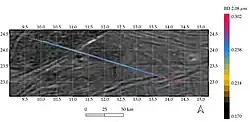 Ganymede's surface has an albedo of about 43 percent.[51] Water ice seems to be ubiquitous on its surface, with a mass fraction of 50–90 percent,[9] significantly more than in Ganymede as a whole. Near-infrared spectroscopy has revealed the presence of strong water ice absorption bands at wavelengths of 1.04, 1.25, 1.5, 2.0 and 3.0 μm.[51] The grooved terrain is brighter and has a more icy composition than the dark terrain.[52] The analysis of high-resolution, near-infrared and UV spectra obtained by the Galileo spacecraft and from Earth observations has revealed various non-water materials: carbon dioxide, sulfur dioxide and, possibly, cyanogen, hydrogen sulfate and various organic compounds.[9][53] Galileo results have also shown magnesium sulfate (MgSO4) and, possibly, sodium sulfate (Na2SO4) on Ganymede's surface.[41][54] These salts may originate from the subsurface ocean.[54]