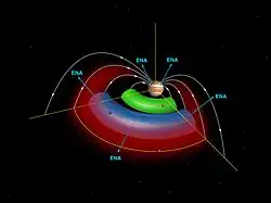 A gas torus is a toroidal cloud of gas or plasma that encircles a planet or moon. In the Solar System, gas tori tend to be produced by the interaction of a satellite's atmosphere with the magnetic field of a planet. The most famous example of this is the Io plasma torus, which is produced by the ionization of roughly 1 ton per second of oxygen and sulfur from the tenuous atmosphere of Jupiter's [1]volcanic moon Io. Before being ionized, these particles are part of a neutral torus, also centered on the orbit of Io. Energetic particle observations also suggest the presence of a neutral torus around the orbit of Jupiter's moon Europa [2]although such a torus would be merged with the outer portions of an Io torus.