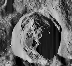 Gassendi is a large lunar impact crater feature located at the northern edge of Mare Humorum. The crater was named after French astronomer Pierre Gassendi by the IAU in 1935.[1] The formation has been inundated by lava during the formation of the mare, so only the rim and the multiple central peaks remain above the surface. The outer rim is worn and eroded, although it retains a generally circular form. A smaller crater – Gassendi A – intrudes into the northern rim, and joins a rough uplift at the northwest part of the floor. The crater pair bear a curious resemblance to a diamond ring.