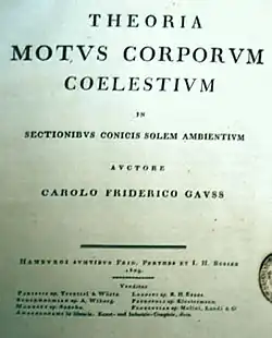 - 1 2 Gauss, Carl Friedrich; Davis, Charles Henry (1857). Theory of the Motion of the Heavenly Bodies Moving about the Sun in Conic Sections. Boston: Little, Brown and Company. p. 2.