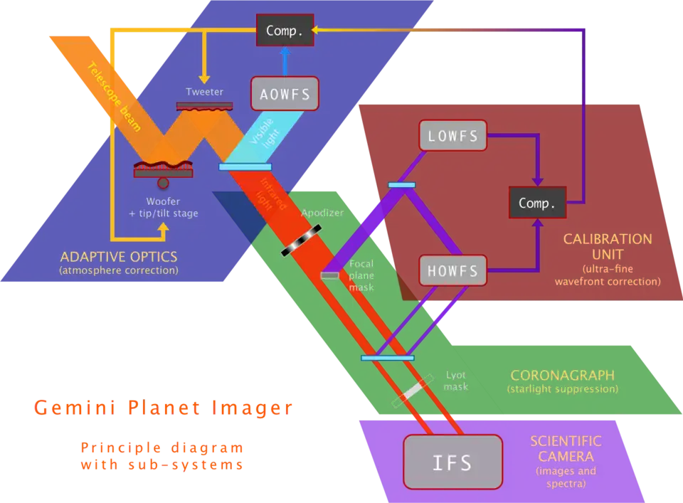 The system consists of multiple components, including a high-order adaptive optics system, a coronagraph, a calibration interferometer, and an integral field spectrograph. The adaptive optics system, being built at LLNL, uses a MEMS deformable mirror from Boston Micromachines Corporation to correct wavefront errors induced by motion of air in the atmosphere and the optics in the telescope. The coronagraph, being built at AMNH, blocks out the light from the star being observed, which is necessary in order to see a much dimmer companion. Before sending the GPI at Gemini South it was essential to test the coronagraph by reproducing the exact experimental conditions in which it was going to be used. A Photon etc. tunable laser source was used for this and helped determine that, at its most efficient wavelength, the imager could detect a planet only slightly more massive than Jupiter around a 100-million-year-old Sun-like star.[4] The spectrograph, developed by UCLA and Montreal, images and takes spectra of any detected companion to the star, with a spectral resolving power of 34 - 83, depending on wavelength. The expected instrument performance will allow for detection of companions one ten millionth as bright as their hosts at angular separations of roughly 0.2-1 arcseconds, down to an H band magnitude of 23.[1]: 3