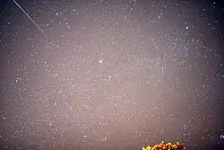 The Geminids are a prolific meteor shower with 3200 Phaethon (which is thought to be an Apollo asteroid[4] with a "rock comet" orbit.[5]) being the parent body.[6] Because of this, it would make this shower, along with the Quadrantids, the only major meteor showers not originating from a comet. The meteors from this shower are slow, they can be seen in December and usually peak around December 4–16, with the date of highest intensity being the morning of December 14. Current showers produce up to 120–160 meteors per hour under optimal conditions, peaking around 2:00 or 3:00. Geminids were first observed in 1862,[1] much later than other showers such as the Perseids (36 AD) and Leonids (902 AD).