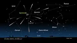 Appearance of the Geminids on 13 December 2025 at 21:00 local winter time
