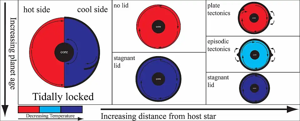 Planets closer than 0.5 astronomical units from their star are likely to be tidally locked; these planets are expected to have drastically different temperature regimes on their "day" and "night" sides. When this scenario is modeled, the day side displays mobile lid convection with diffuse surface deformation flowing toward the night side, while the night side has a plate tectonic regime of downwelling plates and a deep mantle return flow in the direction of the night side. A temperature contrast of 400 K between day and night sides is required to create such a stable system.[5]