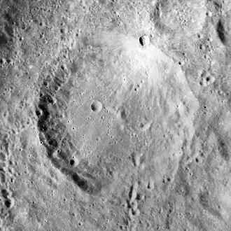 A recent small impact along the northeastern rim, Mirzakhani, has produced a small ray system that forms a skirt of higher albedo material across this part of the rim. Faint traces from these rays cover the interior floor of Gibbs.
